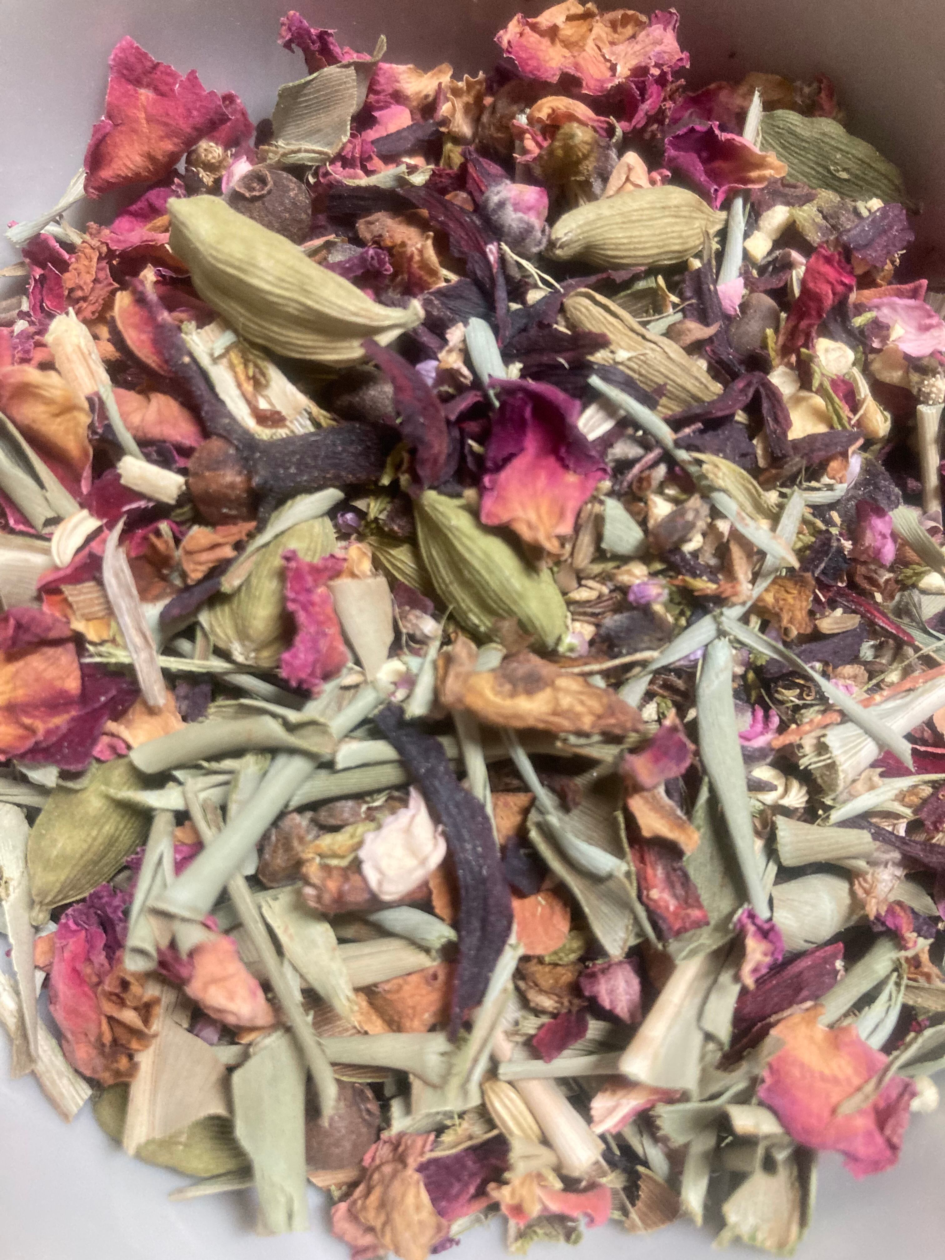 ハイビスカス、ショウガ,カルダモン,月桃、ローズ、桃、オールスパイス、クローブ、フェンネル、ヒース